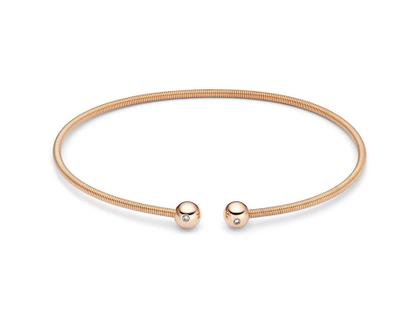 die berühmte Niessing Schnur als Armreif, aus 750/- Rotgold mit zwei Brillant-Kugeln, 2 Brillanten 0,02 ct TW (F) vsi, 5 mm Kugel-Durchmesser