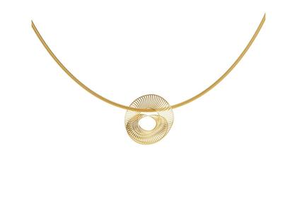 dreidimensionaler Anhänger aus 750/- Gelbgold in der Farbe Classic Yellow, feinmatt (Velvet), feine Lamellen mit polierten Kanten, Durchmesser 20,0 mm