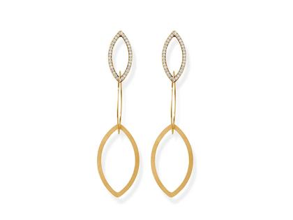 drei bewegliche Elemente Spitzbogen (Navette) aus 750/- Gelbgold, Textur Nature, 80 mm lang, kleines Element mit je 33 Brillanten - im Paar 66 Brillanten 0,66ct TW (G) vsi2