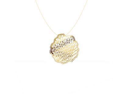 Anhänger aus 750/- Gelbgold in der Farbe Classic Yellow, poliert, Muster aus feinen Dreiecken, mit 94 Brillanten zusammen 0,282 ct TW (G) vsi2, Durchmesser 35,0 mm - Anhänger ohne Halskette