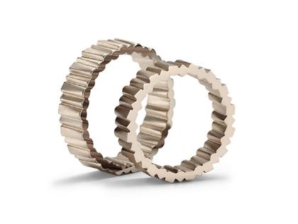 Gegensätze ziehen sich an - Niessing Flux, ein extravaganter Trauring und ein auffälliger, selbstbewusster Schmuckring, ist inspiriert von der Formensprache der Architektur. Leicht versetzt aneinandergereihte Zylinder formen den Ring. Der Querschnitt jedes einzelnen Zylinders durchläuft eine Metamorphose von quadratisch zu kreisrund. Betrachtet man die Ringe von der Seite, stehen Kreis und Quadrat für sich. Erst auf dem Weg zum anderen hin verschmelzen sie miteinander. Niessing Flux vereint beide miteinander, lässt sie unaufhörlich ineinanderfließen – Sinnbild für die Fusion, die zwei Menschen in ihrer Partnerschaft durchleben: Sie werden eins, ohne sich jemals selbst zu verlieren.