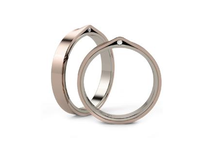 Mein Rückzug, mein sicherer Hafen, mein Schatz - Zwei Bänder aus Gold oder Platin schmiegen sich aneinander. Eine kleine, nach innen gerichtete Aufmerksamkeit, ein geheimer Ort der Besinnung und der Ruhe, den Sie jeden Tag aufsuchen können. In einem kleinen Spalt, der sich öffnet, entdeckt man einen Brillanten, dem Raum und Halt geben wird. In welche Blickrichtung wird der Stein an Ihrem Finger zeigen? Strahlt er nur für Sie – oder zeigt er sich Ihrem Gegenüber? Welche Farben hat Ihre Liebe? Legt sich nach außen warmes Gold, wie eine weiche Decke, schützend über den Diamanten?