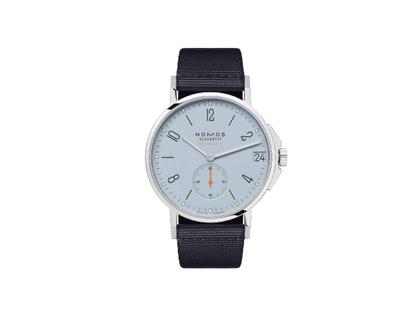 Nomos Glashütte Ahoi neomatik 38 Datum Sky Automatik Edelstahl himmelblaues Zifferblatt dunkelblaues Textilband Stahlboden