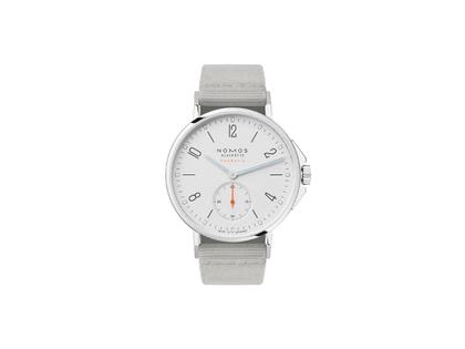 runde Automatikuhr mit hauseigenem NOMOS-Swing-System, NOMOS-Kaliber DUW 3001, Gangdauer 43 Stunden, Edelstahlgehäuse im Durchmesser von 36,3 mm, Höhe 9,55 mm, verschraubte Krone, Zifferblatt galvanisiert, weiß versilbert, Stunden- und Minutenzeiger rhodiniert und mit Superluminova hellblau, seperate kleine Sekunde, Textilband hellgrau mit Dornschließe, gewölbtes Saphirglas, Glasboden, 20 bar wasserdicht
