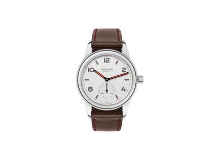 Nomos Glashütte Club 36 Handaufzug Edelstahl elfenbeinfarbenes Zifferblatt braunes Lederband Stahlboden
