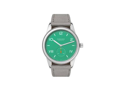 Nomos Glashütte Club Campus 38 Electric Green Handaufzug Edelstahl grünes Zifferblatt graues Lederband