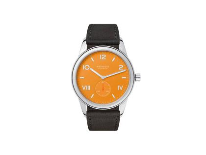 Nomos Glashütte Club Campus 38 Future Orange Handaufzug Edelstahl orangefarbenes Zifferblatt schwarzes Lederband
