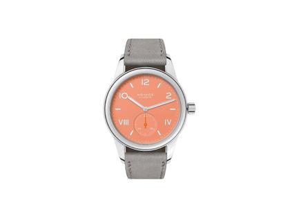 Nomos Glashütte Club Campus 36 Cream Coral Handaufzug Edelstahl korallfarbenes Zifferblatt graues Lederband