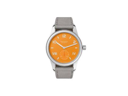 Nomos Glashütte Club Campus 36 Future Orange Handaufzug Edelstahl orangefarbenes Zifferblatt graues Lederband