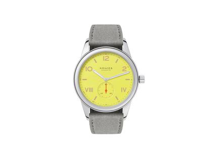 Nomos Glashütte Club Campus Starlight Handaufzug Edelstahl 38mm gelbes Zifferblatt graues Lederband Glasboden