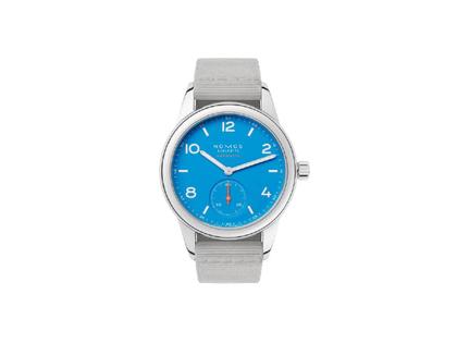 Nomos Glashütte Club neomatik 37 Signalblau Automatik Edelstahl blaues Zifferblatt graues Textilband Glasboden