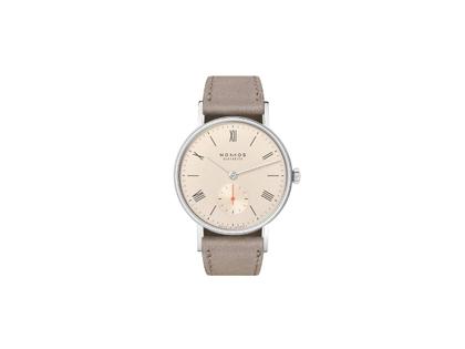 Nomos Glashütte Ludwig 33 Champagner Handaufzug Edelstahl beiges Zifferblatt beiges Lederband Stahlboden