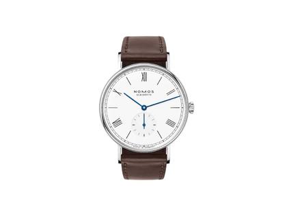Nomos Glashütte Ludwig 38 Emaillleweiß Handaufzug Edelstahl weißes Zifferblatt braunes Lederband Stahlboden