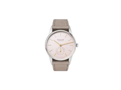 Nomos Glashütte Orion 33 Rosé Handaufzug Edelstahl 33mm roséfarbenes Zifferblatt braunes Lederband Glasboden