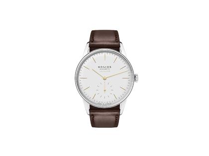 Nomos Glashütte Orion Neomatik Doré Automatik Edelstahl 36mm weißes Zifferblatt braunes Lederband Glasboden