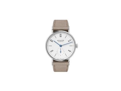 Nomos Glashütte Tangente 33 Handaufzug Edelstahl 33mm weißes Zifferblatt beiges Lederband Glasboden