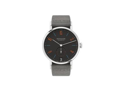 Nomos Glashütte Tangente 38 Datum "175 Years Watchmaking - Dunkelbunt" Handaufzug Edelstahl schwarzes Zifferblatt graues Textilband Glasboden