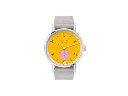 Nomos Glashütte Tangente 38 Datum "175 Years Watchmaking - Katzengold" Handaufzug Edelstahl gelbes Zifferblatt graues Textilband Glasboden