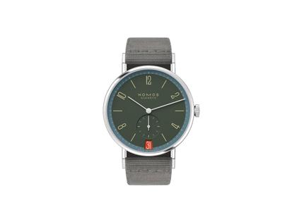 Nomos Glashütte Tangente 38 Datum "175 Years Watchmaking - Lakritze" Handaufzug Edelstahl graues Zifferblatt graues Textilband Glasboden