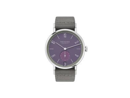 Nomos Glashütte Tangente 38 Datum "175 Years Watchmaking - Mauvegrün" Handaufzug Edelstahl violettes Zifferblatt graues Textilband Glasboden