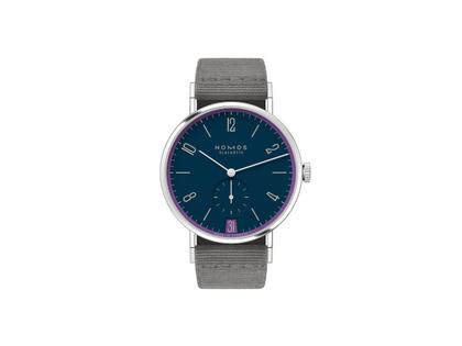 Nomos Glashütte Tangente 38 Datum "175 Years Watchmaking - Nachtgesang" Handaufzug Edelstahl blaues Zifferblatt graues Textilband Glasboden
