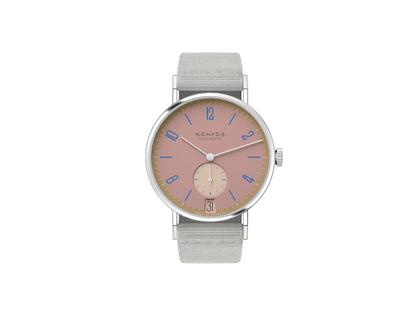 Nomos Glashütte Tangente 38 Datum "175 Years Watchmaking - Pompadour" Handaufzug Edelstahl rosa Zifferblatt graues Textilband Glasboden