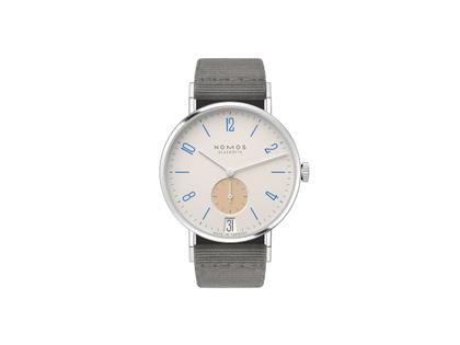 Nomos Glashütte Tangente 38 Datum "175 Years Watchmaking - Schulhausweiß" Handaufzug Edelstahl cremeweißes Zifferblatt graues Textilband Glasboden