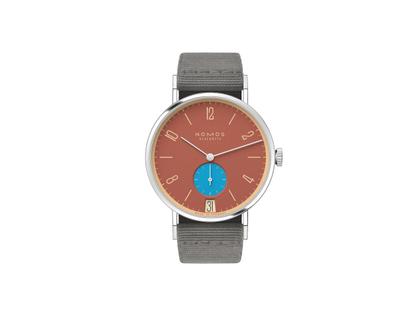 Nomos Glashütte Tangente 38 Datum "175 Years Watchmaking - Ziegelblau" Handaufzug Edelstahl rotes Zifferblatt graues Textilband Glasboden