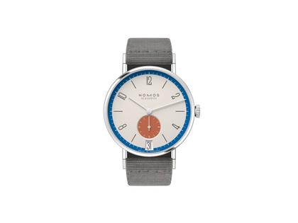 Nomos Glashütte Tangente 38 Datum "175 Years Watchmaking - Zirkus" Handaufzug Edelstahl cremeweißes Zifferblatt graues Textilband Glasboden