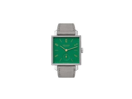 aus der Serie Berliner Mischung, in Anlehnung an das Berliner Ballhaus Clärchen, Manufakturwerk mit Handaufzug, Nomos Kaliber Alpha, 43 Stunden Gangreserve, Edelstahlgehäuse, 29,5 mm x 29,5 mm, Höhe 6,5 mm, billiardtisch-grünes Zifferblatt mit separater kleiner Sekunde, graues Velourslederband mit Dornschließe, Saphirglas, Saphirglasboden, 3 bar wasserdicht