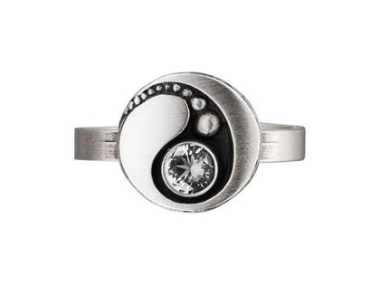 Damenring aus mattiertem 925/- Silber, teilweise geschwärzt mit einem runden Aufsatz im Durchmesser von 11 mm, mit einem runden Bergkristall