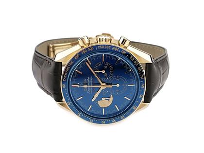 Handaufzugswerk Kaliber Omega 1861 (eines der berühmtesten Uhrwerke von Omega und der Nachfolger des legendären Uhrwerks 321, das auf dem Mond getragen wurde), 48 Stunden Gangdauer, 21.600 A/h, 18 Rubine, Gehäuse aus 750/- Gelbgold (Moonshine Gold™), blaue Keramiklünette, Durchmesser 42,0 mm, Höhe 14,9 mm, blaues Keramik-Zifferblatt mit Gelbgold, braunes originales Alligatorlederband mit Faltschließe aus Gelbgold, Bandanstoß 20,0 mm, Saphirglas entspiegelt, gravierter Boden, 5 bar wasserdicht - limitiert auf 272 Exemplare weltweit