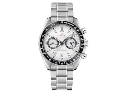 Schweizer Automatikwerk Omega 9900 mit einer Gangreseve von 60 Stunden, Chronometer, Edelstahlgehäuse im Durchmesser von 44,25 mm, Höhe 12,8 mm, Edelstahl-Krone und Drücker, Keramiklünette mit schwarzer Tachymeterskala, weißes Zifferblatt mit Datumsanzeige auf 6 Uhr, 12-Stunden-Zähler auf 3 Uhr, kleine Sekunde auf 9 Uhr, geschwärzter Stunden- und Minutenzeiger mit weißer Super-LumiNova Leuchtmasse, schwarze Indizes mit weißer Super-LumiNova Leuchtmasse, Edelstahlband mit Faltschließe, Saphirglas, kratzresistent und anti-reflektierend, Edelstahl-Gehäuseboden mit Saphirglas-Einsatz, 5 bar wasserdicht