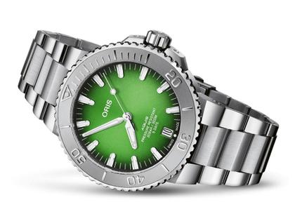 runde Herrenuhr, Automatik Kaliber 400, in der Manufaktur von Oris entwickelt, 120 Stunden Gangreserve, Doppelfederhaus, antimagnetisch, Edelstahlgehäuse im Durchmesser von 43,5 mm, Lünette mit Minutenskala, grünes Zifferblatt mit Verlauf Effekt, Datumsanzeige, Zentralsekunde, mit Super-LumiNova®, Edelstahlband mit Faltschließe und Quick Strap Bandschnellwechsel-System, Saphirglas, 30 bar wasserdicht, Edelstahlboden mit Spezialgravur