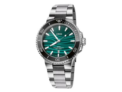 Schweizer Manufaktur-Automatikwerk Kaliber Oris 733 mit einer Gangreserve von 41 Stunden, poliertes mehrteiliges Edelstahlgehäuse im Durchmesser von 43,5 mm, Höhe 13,1 mm, verschraubte Edelstahl-Krone, einseitig drehbare Edelstahl-Lünette mit Minutenskala-Relief, grünes Wellenmuster-Zifferblatt, Datumsanzeige auf 6 Uhr, silberfarbener Stunden- und Minutenzeiger mit weißer Super-LumiNova® Leuchtmasse, silberfarbener Lollipop Sekundenzeiger, silberfarbene Indizes mit weißer Super-LumiNova® Leuchtmasse, weiße Minuterie, poliertes mehrgliedriges Edelstahlarmband mit Faltschließe, Saphirglas beidseitig gewölbt und innen entspiegelt, verschraubter Edelstahl-Gehäuseboden mit Mineralglas-Einsatz, 30 bar wasserdicht