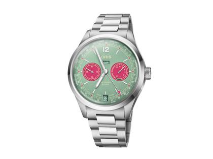 Farbpalette. Der Hauptteil des Zifferblatts ist mintgrün, während die Zähler und einige Details des Zifferblatts in Pink gehalten sind. Für mehr Kontrast und einfache Ablesbarkeit sind einige Details des Zifferblatts in Gold, andere in Weiss abgesetzt. Die Uhr kommt mit einem flexiblen, sich verjüngenden Metallarmband. Das Ergebnis ist ein gelungener Ausdruck der stolzen Uhrmachertradition von Oris.