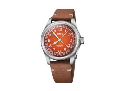 Oris Big Crown Pointer Date X Cervo Volante Automatik Edelstahl 40mm orangefarbenes Zifferblatt braunes Lederband