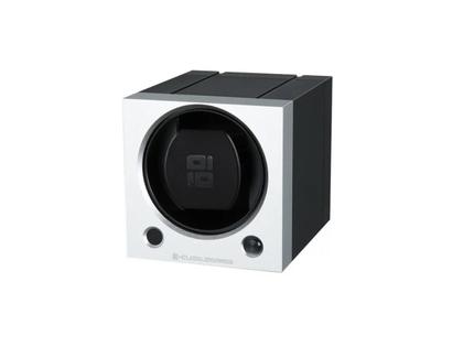 Uhrenbeweger für 1 Uhr, Aluminium mit silberner Lackierung (seidenmatt), Uhrenaufnehmer in schwarzem Velour, Einfache Bedienung über Push-Button, Batterie– und Netzbetrieb möglich, stapelbar (bis zu 9 Uhrenbeweger), Maße 110 x 110 x 130 mm