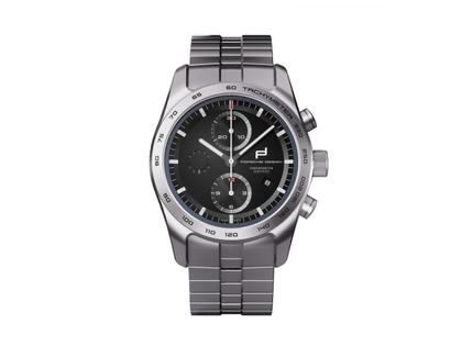 Schweizer Automatik Porsche Design Kaliber WERK 01.100 COSC-zertifiziert mit 28.800 Halbschwingungen je Stunde und einer Gangdauer von 48 Stunden, Chronograph mit Flyback-Funktion, glasperlgestrahltes Titangehäuse im Durchmesser von 42,0 mm, Höhe 14,6 mm, verschraubte Titan-Krone und Titan-Drücker, Titan-Lünette mit schwarz aufgedruckter Tachymeterskala, schwarzes Zifferblatt, Datumsanzeige auf 4 Uhr, 12-Stunden-Zähler auf 6 Uhr, kleine Sekunde auf 9 Uhr, 30-Minuten-Zähler auf 12 Uhr, schwarzer Stunden- und Minutenzeiger mit weißer Super-LumiNova® Leuchtmasse, weißer Stopp-Sekundenzeiger mit weißer Super-LumiNova® Leuchtmasse und roter Spitze, silberfarbene Stunden-Indizes, weiße Minuterie, Zifferblatt-Außenring in der Farbe "DarkNightBlue", poliertes mehrgliedriges Titanarmband mit Titan-Edelstahl-Faltschließe und Sicherheitsdrückern sowie Armband-Schnellwechsel-System, konvexes kratzfestes Saphirglas mit Hartbeschichtung beidseitig siebenfach entspiegelt, Titan-Gehäuseboden mit Saphirglas-Einsatz, 5 bar wasserdicht