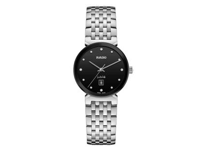 Das harmonische Design der Rado Florence Classic ruft einem die eleganten Kuppeln und Türme der Stadt in Erinnerung, der die Kollektion ihren Namen zu verdanken hat. Die 30 mm grosse Uhr verfügt über ein gewölbtes Saphirglas mit facettierten Rändern. Gehäuse, Lünette, Krone und Armband sind aus poliertem Edelstahl gefertigt. Das schwarze Zifferblatt mit Sonnenschliff und 12 Diamanten wird durch das per Druck aufgetragene Jubilé-Logo noch besser zur Geltung gebracht und ist perfekt auf die rhodiumfarbenen Zeiger abgestimmt. Dank ihres R079 Quarzwerks mit drei Zeigern zeichnet sich die Uhr durch eine grössere Genauigkeit und Stossfestigkeit aus. Die Uhr ist bis zu einer Tiefe von 50 m wasserdicht und auch in Grösse L erhältlich – damit ist sie die perfekte Paar-Uhr.