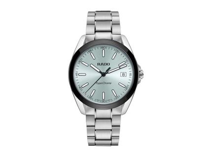 Die HyperChrome Quartz ist ein zeitgemässer Ausdruck von Präzision und meisterhafter Materialbeherrschung und vereint fortgeschrittene Uhrentechnik mit einem innovativen, langlebigen Design. Das Gehäuse aus poliertem und satiniertem Edelstahl wird von einer Lünette aus polierter, schwarzer Hightech-Keramik umschlossen – eine elementare Kombination aus Stärke und Raffinesse. Das gewölbte Saphirglas mit Antireflexionsbeschichtung auf der Innenseite bietet eine aussergewöhnliche Kratzfestigkeit und kristallklare Ablesbarkeit. Mit einer Wasserdichtigkeit bis 15 bar (150 Meter) bieten alle Bauteile dauerhafte Präzision, Langlebigkeit und Zuverlässigkeit, unabhängig von der Umgebung. Auch das Herzstück der Uhr, das Rado Kaliber R292, sorgt für aussergewöhnliche Ganggenauigkeit und Zuverlässigkeit. Das mit 3 Steinen versehene Quarzwerk kombiniert die Technologien PreciDrive und HeavyDrive, die eine präzise Regulierung der einzelnen Impulse ermöglichen und eine Abweichung von maximal ±10 Sekunden pro Jahr gewährleisten. Ein diskretes Datumsfenster bei 3 Uhr fügt sich nahtlos in das ausgewogene Design des Zifferblatts ein. Das eisblau lackierte Zifferblatt mit Sonnenschliff bietet einen raffinierten Kontrast zu den schwarzen PVD-beschichteten Zeigern und Indizes, die alle mit weissem Super-LumiNova® versehen und damit auch bei schlechten Lichtverhältnissen optimal abzulesen sind. Nachts leuchten der Index bei 12 Uhr und der Minutenzeiger grün, während die übrigen Indizes und der Stundenzeiger blau leuchten – für ein schnelles, intuitives Ablesen der Zeit bei allen Lichtverhältnissen. Abgerundet wird das Gehäuse durch ein dreireihiges Edelstahlarmband mit satinierten Aussengliedern und Mittelgliedern, die mit polierten Facetten akzentuiert sind und ein raffiniertes Wechselspiel der Texturen bilden. Das Armband wird mit einer Dreifach-Faltschliesse mit dreistufigem Schnellverstellsystem am Handgelenk gesichert. Damit sitzt die Uhr jederzeit passgenau und komfortabel.
