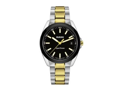 Rado HyperChrome Quarz Edelstahl 41,5mm schwarzes Zifferblatt zweifarbiges Metallband