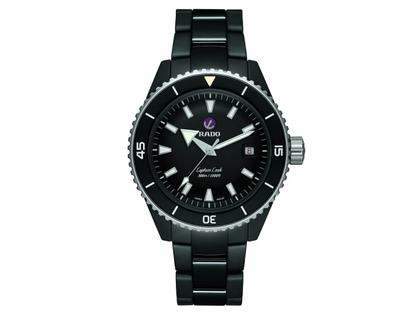 Die Rado Captain Cook High-Tech Ceramic Diver ist bis zu einer Tiefe von 300 m wasserdicht. Zeiger und Indizes der nach der ISO-Norm 6425 zertifizierten Taucheruhr sind mit SuperLuminova beschichtet und damit auf dem schwarz lackierten und polierten Zifferblatt ausgezeichnet sichtbar. Das 43 mm große Monobloc-Gehäuse ist aus mattschwarzer Hightech-Keramik gefertigt, während die drehbare Lünette aus gehärtetem polierten Edelstahl ist. Im Inneren ist der Zeitmesser mit einem Rado R763 Automatikwerk ausgestattet, das die Voraussetzungen des Standard-Genauigkeitstests um volle fünf Punkte übertrifft und eine Gangreserve von 80 Stunden bietet.