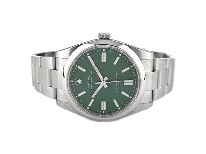 Hier bieten wir Ihnen eine neuwertige Rolex Oyster Perpetual 41 in der gefragten grünen Zifferblatt-Ausführung an. Die Uhr wurde von einem Kunden unseres Hauses im Juli 2022 bei einem deutschen Konzessionär gekauft und nun ungetragen und neuwertig in Zahlung gegeben. Wir bieten Ihnen somit eine ganz besondere Uhr an, die bis Juli 2027 Herstellergarantie hat und gewähren zudem 1 Jahr Garantie ab Kaufdatum.