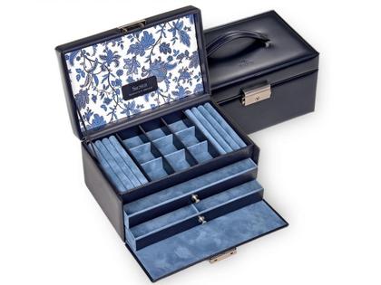 aus italienischem Echtleder mit elegantem und robustem Tragegriff, navy, innen hellblau, 2 Ringpolster, 2 geräumige Schubfächer, davon 1 unterteilt, 9 kleine Fächer (ca. 35 x 35 mm), abschließbares Schloss, 100% handmade in Germany, 220 x 140 x 115 mm