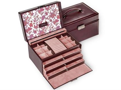 Lederimitat in nobler Nappaoptik mit weicher Haptik und elegantem sowie robustem Tragegriff, bordeaux florage, innen rosa, großes Ringpolster, 3 geräumige Schubfächer, davon 2 unterteilt, 12 kleine Fächer, 1 entnehmbares Kettenfach mit Hakenleiste, abschließbares Schloss, 100% handmade in Germany, 265 x 185 x 160mm