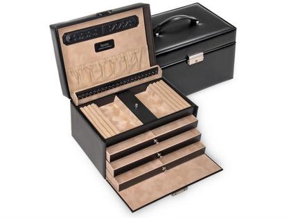 aus italienischem Echtleder mit elegantem und robustem Tragegriff, schwarz, innen beige, 2 Ringpolster, 3 geräumige Schubfächer, davon 2 unterteilt, 1 entnehmbares Kettenfach mit Hakenleiste und ein Fach mit abnehmbaren Deckelchen, doppeltes Schmuckband sowie eingenähte Tasche im Deckel, abschließbares Schloss, 100% handmade in Germany, 270 x 180 x 160 mm