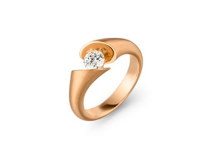 Ring aus 750/- Roségold mit "gespanntem" Brillant 0,50 ct TW G si1, mattierte Außenfläche, polierte Spiegelflächen - um das Funkelns des Diamanten noch verstärken zu lassen.