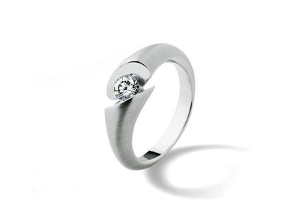 Ring aus 750/- Weißgold mit "gespanntem" Brillant 0,130 ct TW(G) vsi, mattierte Außenfläche, polierte Spiegelflächen um den Diamant lassen das Funkeln noch verstärken