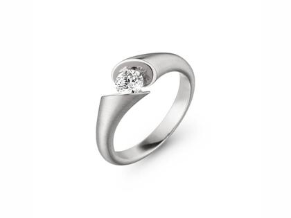 Damenring aus 750/- Weißgold mit "gespanntem" Brillant 0,40 ct TW G si1, mattierte Außenfläche, polierte Spiegelflächen - um das Funkelns des Diamanten noch verstärken zu lassen.